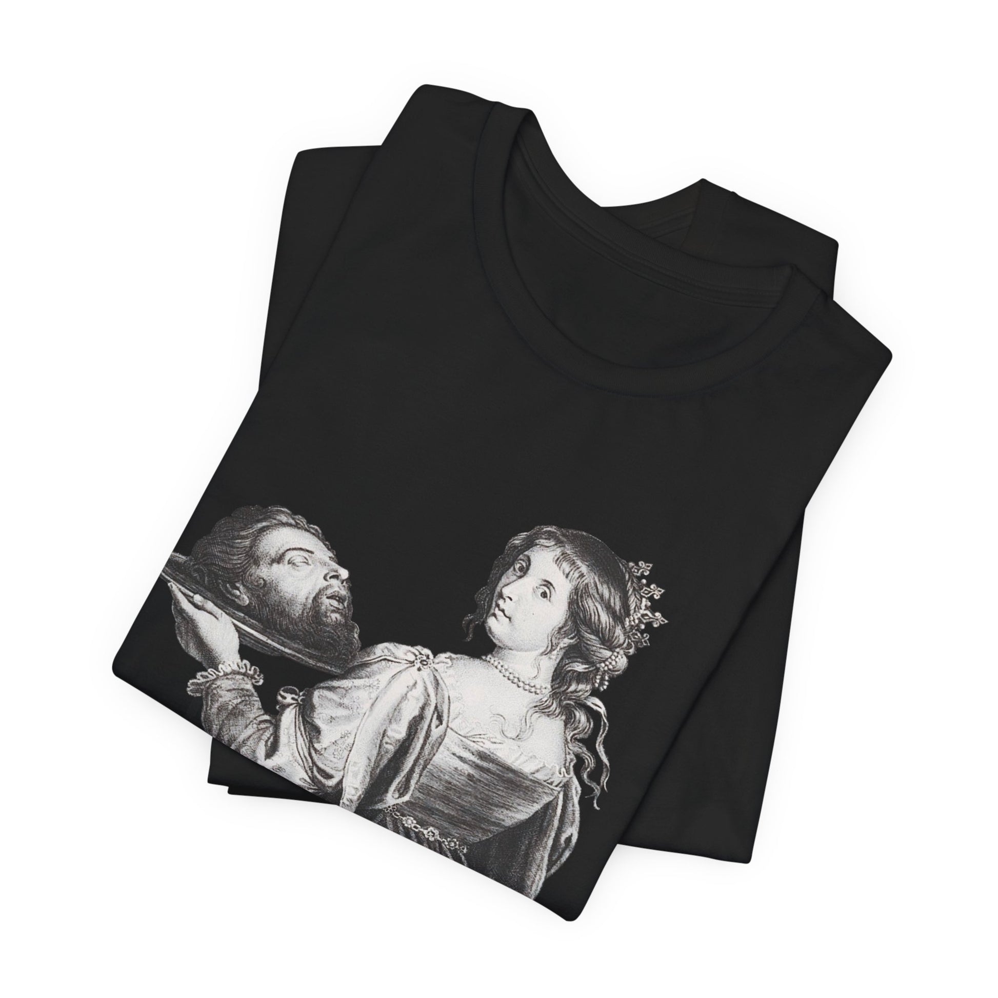 The depiction of Salome holding St. John's head has been a recurrent theme in art and literature. In a feminist context, this imagery can be interpreted in various ways. Some see it as a symbol of female agency and rebellion, challenging traditional gender roles. Others focus on the sexualized portrayal of Salome, addressing issues of objectification. The beheading of St. John can be viewed as a symbolic act of challenging male authority. Salome's role in the story may be seen as a subversion of patriarchal power structures, where a woman takes a central and assertive role in a narrative often dominated by male figures. 🖤Printed on Bella Canvas 3001 Unisex Tee 🖤 Made with 100% Airlume combed and ring-spun cotton 🖤Manufactured in humane, no-sweat-shop Please make sure to check the size chart in the images before placing your order. Please reach out with any size-related questions before ordering. Returns and exchanges are not accepted due to the nature of print on demand. My goal is for you to be happy with your order, so if you encounter any issues with your received item, send me a message, and we'll find a solution together!