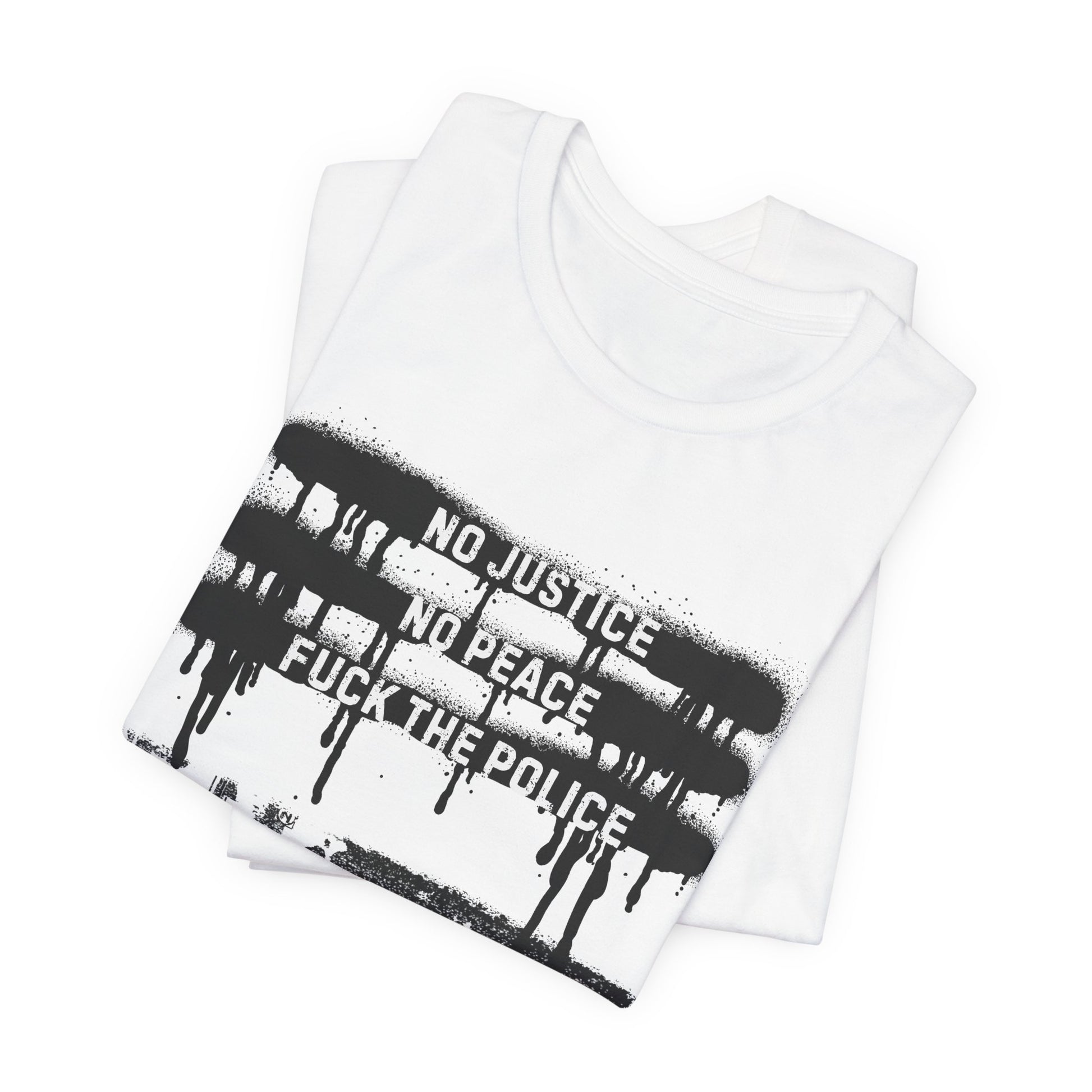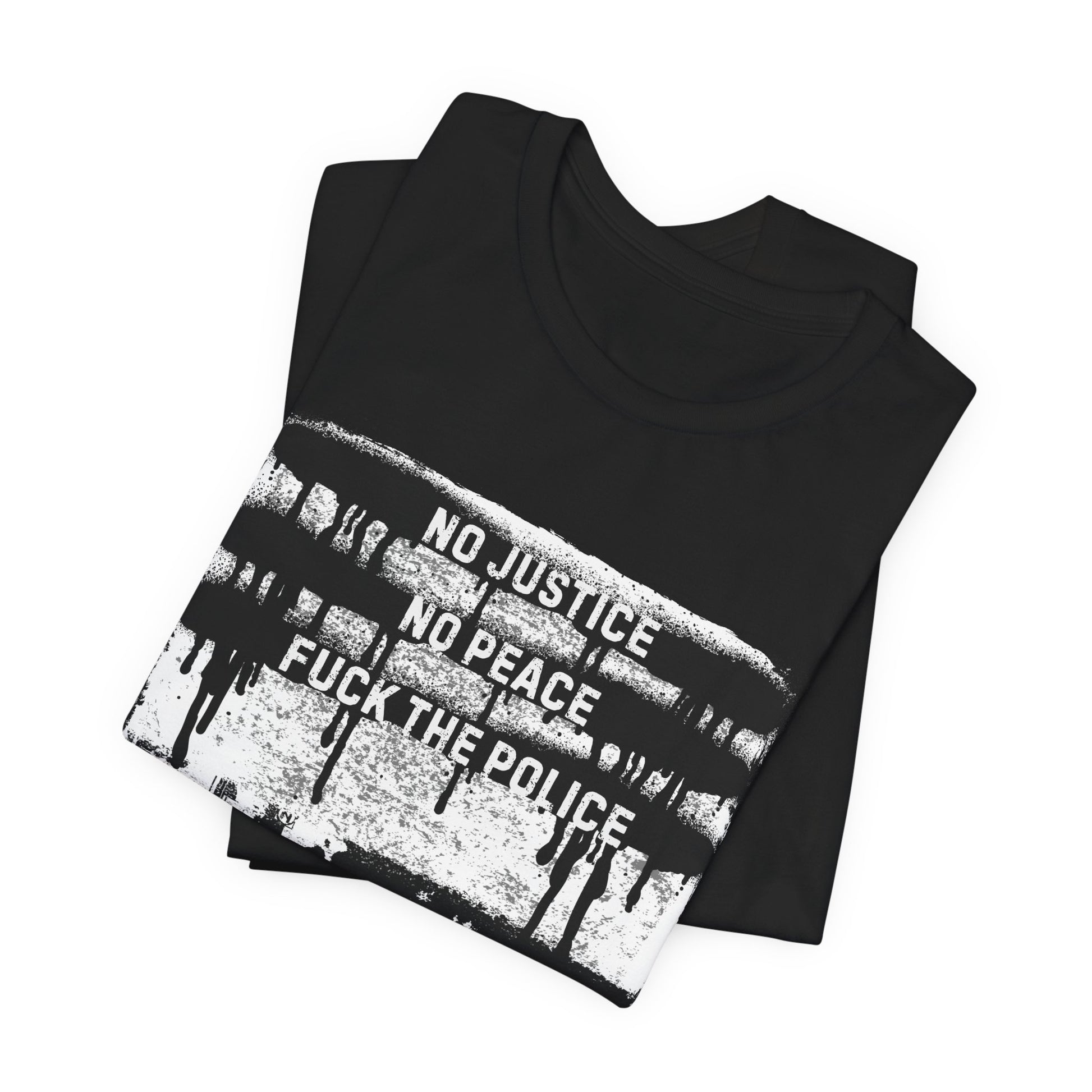 Protest against police brutality in this print with iconic slogan! "No justice, no peace" is a political slogan which originated during protests against acts of ethnic violence against African Americans.The slogan was used as early as 1986, following the killing of Michael Griffith by a mob of youths.